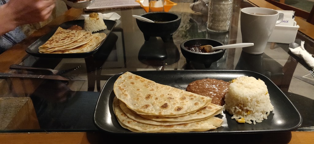 Edit: more about the food has been requested. It’s a big part of Mexico that I’d previously missed out – blame the driving fatigue. When we’ve eaten out, the food has been good and worth the price. Burritos are generally the order of the day, with frijoles (refried beans (though refried is a misnomer – refrito just means fried)) and rice and various things made of maize. They like their hot foot, and you almost always get hard tortillas and a spicy dip or two for free when you walk into the restaurant, like a Spanish tapas. We’ve not drunk alcohol out but they serve good fruit juices. We’re trying to buy cheap supermarket food to eat cold in order to save money, but it’s difficult here as most ready-to-eat food is crisps, fat, sugar, more fat and more sugar. There’s a traditional Mexican cheese called Oaxaca, which is a bit like mozzarella, but most cheese is like that in the USA – sliced and highly processed. The ‘chorizo’ is interesting – I’ve just used some for a pasta sauce. It’s just a paste/mince which you use to flavour things, rather than a hard sausage which they don’t really do here. Unfortunately we didn’t try the seafood by the coast, but the lobster from Guerrero Negro is meant to be some of the most expensive in the world, with a lot sold to the wealthy Chinese market.