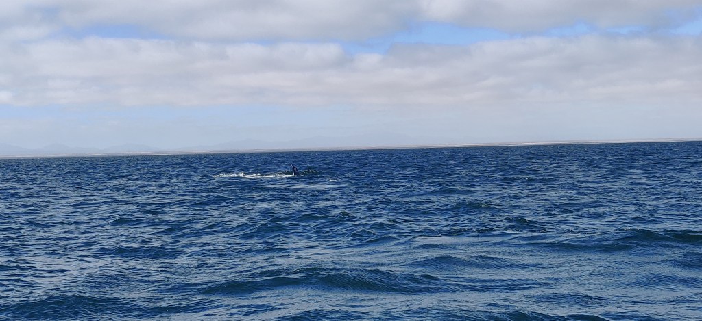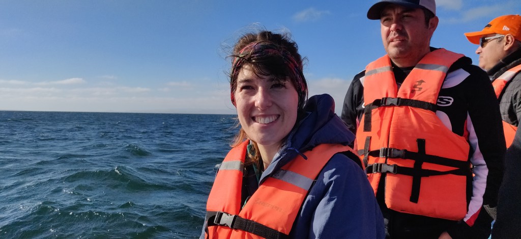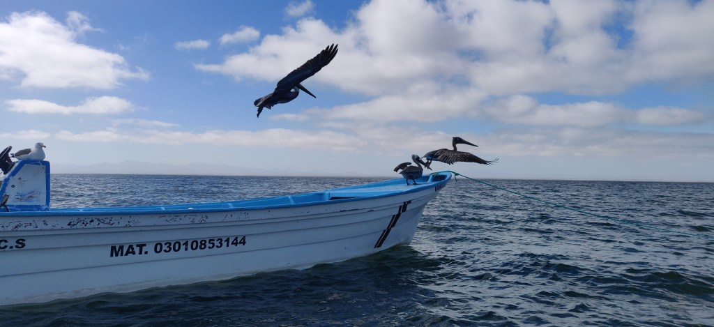 In Guerrero Negro, we had a choice of whale-watching tours, and chose to go with the one based at our hotel. At 9am we were taken down to the peninsula marina to embark on the fishing boat which would take us out into the lagoon. On the way, we travelled through the largest salt production plant in the world. The salt plant is the reason Guerrero Negro was founded, in the 1950s. It supplies salt for chemical works to countries all around the Pacific Rim. It’s a weird place to drive through, with a huge mountain of salt in the middle, looking like the top of an Alpine mountain. Apparently the mountain was worth $5,000,000. We saw lots of ospreys and pelicans on the way – the peninsular is a huge nature reserve and a world heritage site. Grey whales were hunted in Ojo de Liebre from the 1850s and rapidly driven to near extinction. It’s the only place in the world they mate and give birth, as it’s a protected location with a high salt content, so babies float to the surface easily after birth. The males guard the lagoon entrance while the females are giving birth, stopping predators like killer whales and great white sharks from entering.