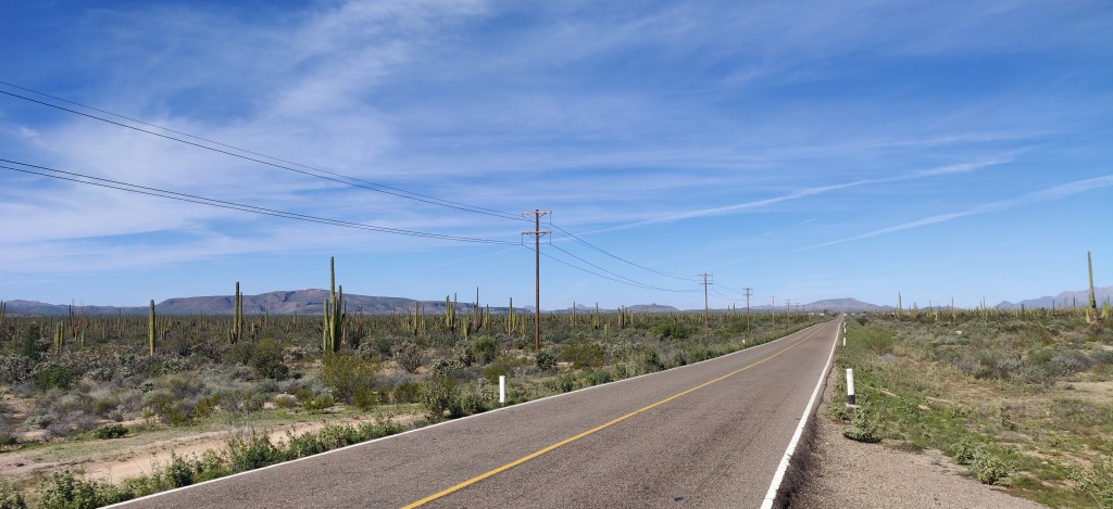 We left Guerrero Negro this morning and set off up the Eastern side of Baja California, along the coast of the Sea of Cortes – famous for its high population of Great Whites. We saw a couple of coyotes crossing the road on the way. We’ve got two more nights in Mexico before we cross the border back into the USA and spend a night before picking up our camper van for 11 days of freedom around California.
