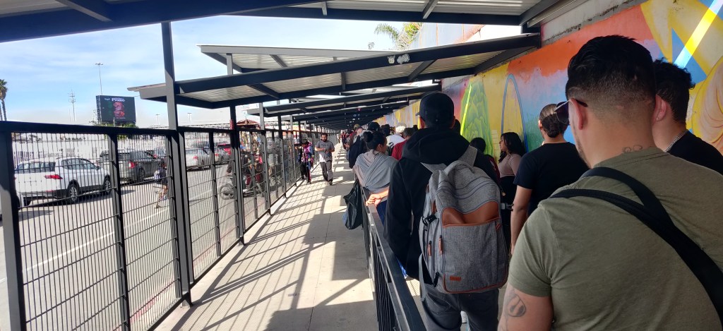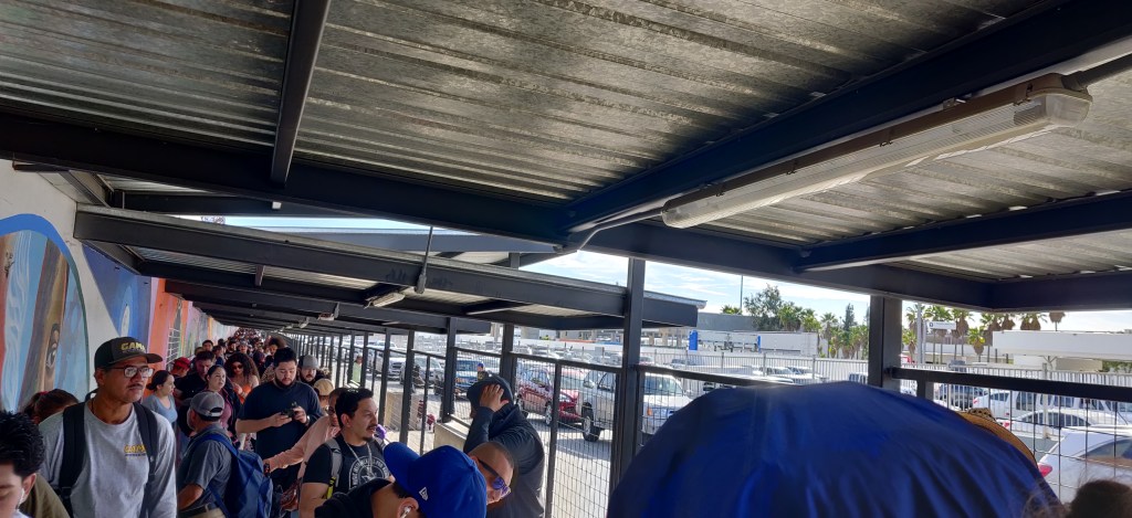 We crossed the border back into the USA by foot and had a very different experience to crossing the other way, when we just walked straight through with no crowds and no passport checks. The crossing time varies hugely based on the time of day and the weather, and it’s always much, much easier to cross from the US to Mexico. Early in the morning and around 6pm are busy times as people are crossing the border for work. We crossed on a Sunday afternoon, so assumed it wouldn’t be too busy – we were wrong. We used the same Otay Mesa crossing we’d used to enter Mexico, and joined the queue about 200m back from the border. We were the only non-Mexicans; there’s a parallel line for US passport holders, who can walk straight through with minimal checks, and we had some funny looks from people around us who were presumably wondering why we weren’t using the other queue. After about an hour and a half they let a group of about 15 of us through into a small compound where we waited for our passports to be checked and let through.