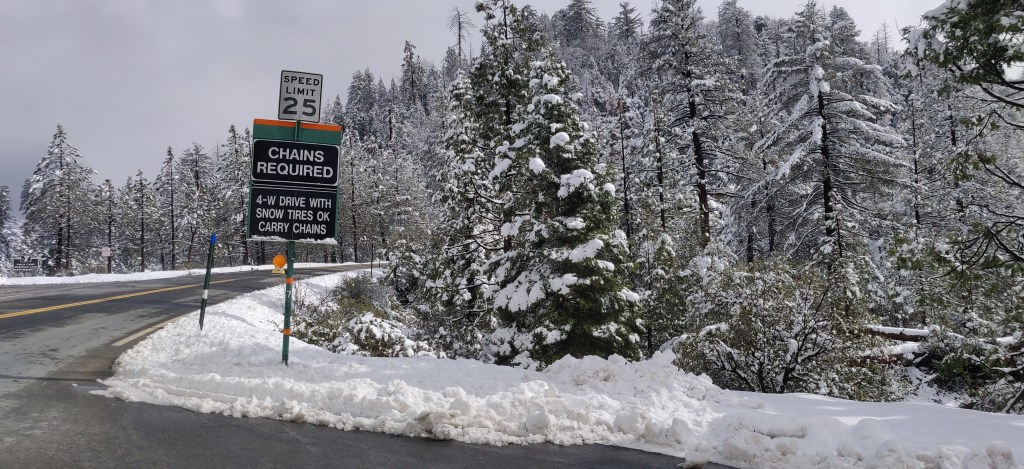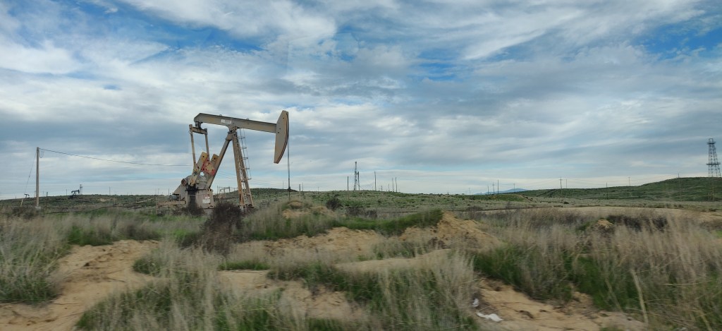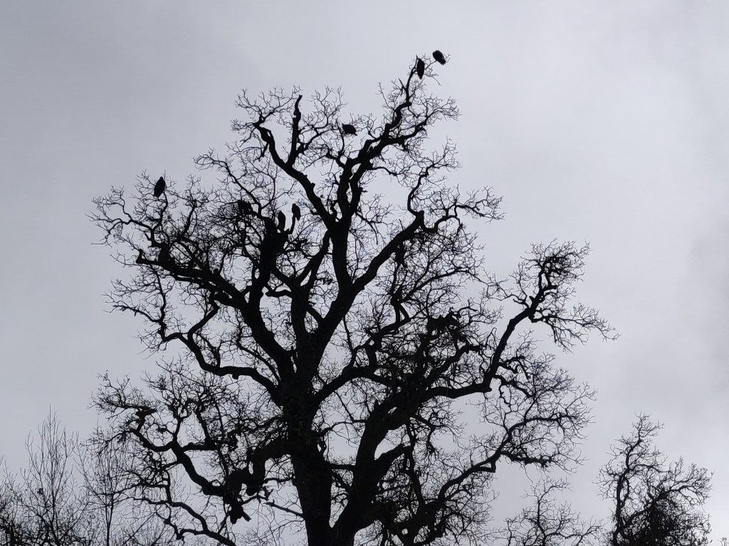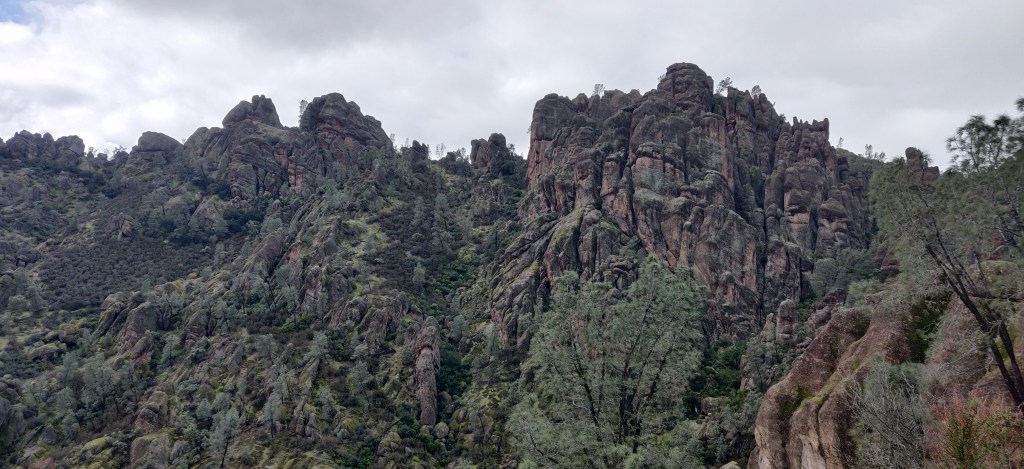At this time, an ‘atmospheric river’ was entering the sky above Los Angeles and the weather was going a bit wild. We’d only stayed one night in each place and driven for hours every day so we decided to stay somewhere for a few nights to recuperate. We went to The Pinnacles National Park, a small NP and one of the newest, it only having been made a NP in 2013. To get there we crossed the Central Valley, the bit of California between the coastal mountains and the Sierrra Nevada. It’s completely flat and dedicated almost entirely to arable farming and oil production. There were high winds when we crossed, and there were orchards with trees ripped out of the ground, fallen telegraph poles and blown-off roofs all over the place.