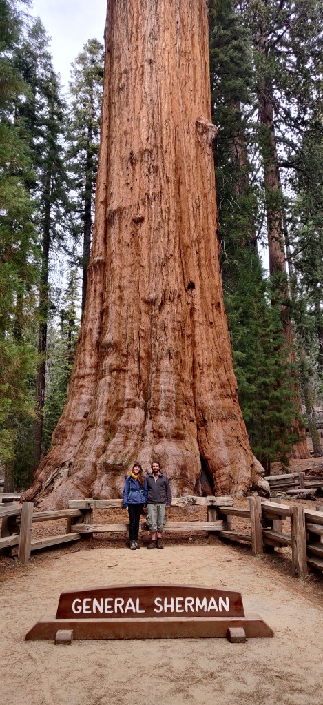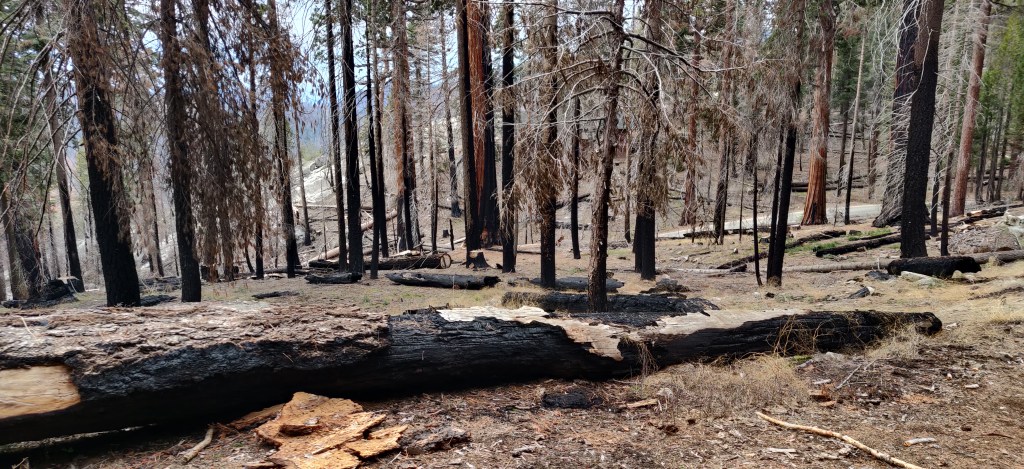 Nevertheless, the camper did its job and over the next 11 days we managed to cover a lot of ground. I think the Californian weather over the last week or so has even been on the news in the UK – very heavy rainstorms, high wind and snowstorms in the mountains. We had planned to start at Death Valley, just to the east of the southern end of the Sierra Nevada, and then head into the mountains. Because of the forecast, we changed our plan and decided to drop Death Valley and head north into the mountains before the bad weather was due in two days time. We went to Sequoia National Park and saw General Sherman, the largest tree in the world by volume. A giant redwood, GS is thought to be around 2,500 years old. The main stem alone has a volume of nearly 1,500m3. Compare this to the UK, where a conifer considered to be large might just have a main stem volume of 3 or 4m3. I hadn’t realised before going that GS was situated on a small plateau on top of a mountain at just over 2000m – large trees in the UK tend to be at lower altitudes and in sheltered valleys. When you see it, it’s clearly huge, but as it’s in a forest surrounded by other giant redwoods its size doesn’t really compute at first. The giant redwoods are dominant but they’re surrounded by white and red fir, sugar and ponderosa pines, and incense cedar. Even large specimens of these other trees seem tiny in comparison – it really gives a sense of perspective and it’s impossible to convey in photos. Immediately noticeable as you drive up the General’s Highway is the fire damage everywhere, dating back decades. The last couple of summers have been bad for big forest/ scrubland fires in California, though it’s not obvious anywhere but woodland. The redwoods get seriously scorched but seem not to be mortally damaged, whereas (at least in the bigger fires) pretty much everything else dies and a huge green flush of vegetation appears a year or two later.