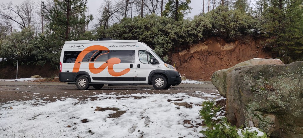 A day later we picked up our camper from LA and hurried as fast as we could to leave the city again. The camper was a van conversion (a Thor Tellaro if anyone’s interested), 6.7m (22′) long. We had gas and electric powering water, a stove and a heater. The internal design wasn’t ideal – the toilet/ shower was at the back and the bed folded out in the middle, making the toilet very difficult to access once the bed was out and sitting on its flimsy brackets. Most of the power sockets didn’t work and later on, once it started raining, we discovered two leaks in the roof.