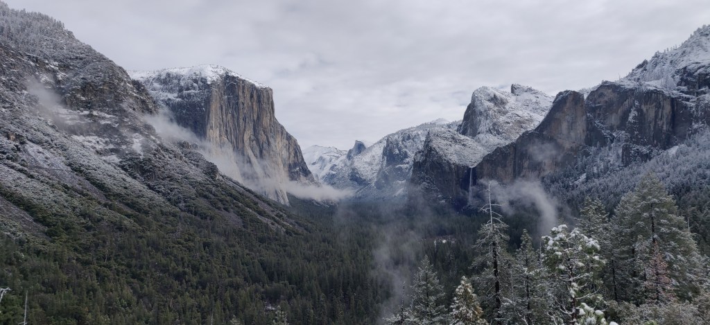 We went to Yosemite, the second most spectacular place I’ve ever been, the first being the Norwegian fjords. As the weather was coming in, only Yosemite Valley was accessible – all the footpaths from there head straight up the mountain and you’d quickly be blocked by snow. El Capitan is very impressive – a 1000m sheer cliff face. People climb it and camp on the way up with tents suspended in mid-air from the rock face. We weren’t interested in doing that ourselves!