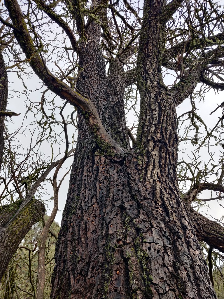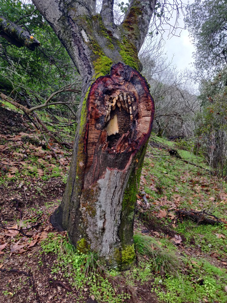 The wildlife here is very tame – in National Parks in the US, you’re not allowed to leave the path and animals seem to know this. Deer, groundhogs and woodpeckers will sit quite happily a couple of metres away from you. In several instances, deer have actually walked towards us, completely unfazed. We’ve seen mule deer, Californian condors, raccoons, various iridescent blue jays, turkey vultures, turkeys, and a huge bee nest in a tree at eye level. There are acorn woodpeckers everywhere, which collect acorns and create small cavities all over a tree trunk to keep them in.