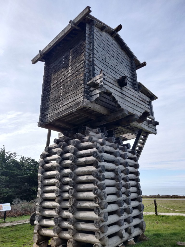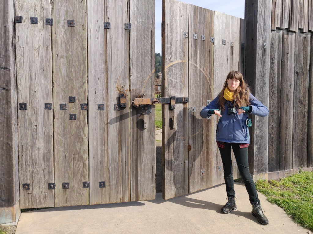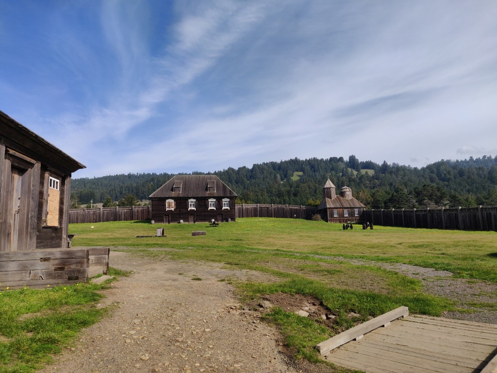 Heading North again, we came to the southernmost point of Russian America – Fort Ross (from Rus’, or Russia). Unfortunately it was closed and as it’s a fort it was difficult to break into so we just walked around the outside. They have one of the biggest eucalyptus trees I’ve ever seen there. The replica fort was constructed in the 1920s and it looks like traditional techniques of hewing and joining were used. We’d paid the full entrance fee into a trust box before going in with no indication that the fort was closed, so on the way out we fished out our payment with a piece of wire.