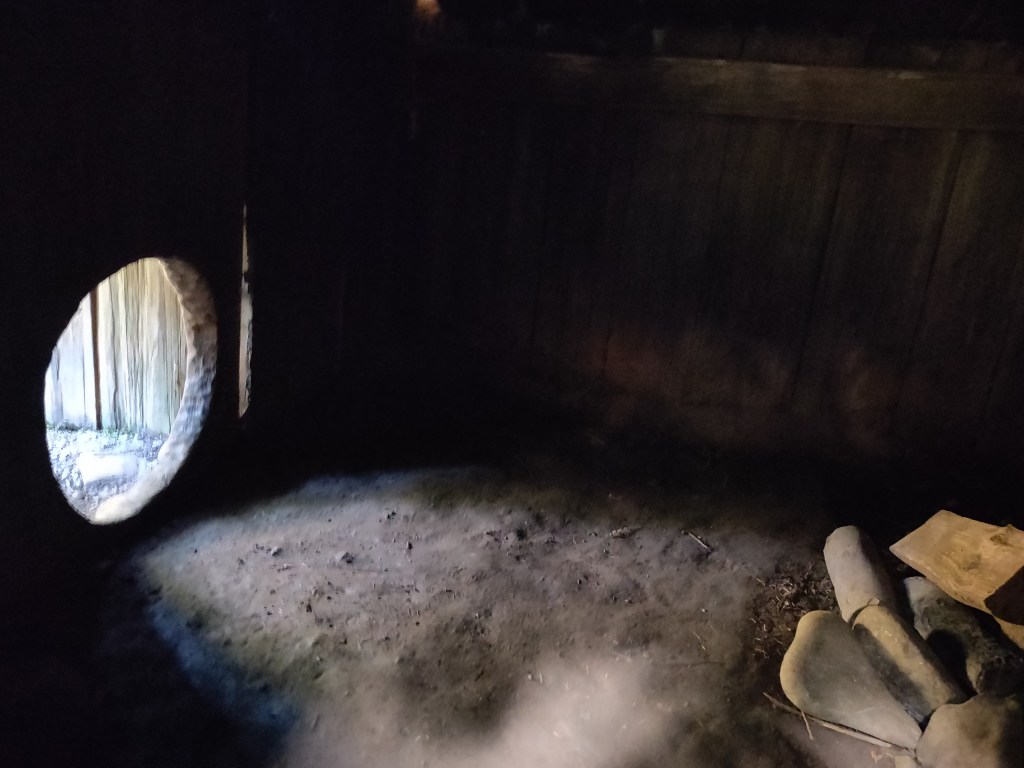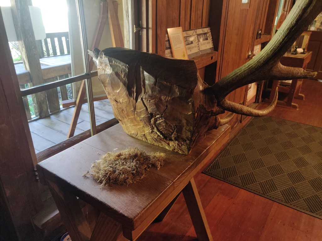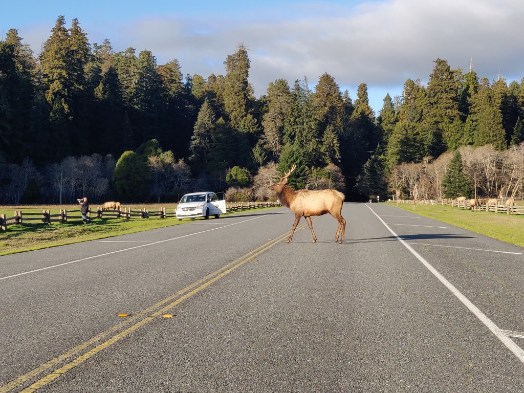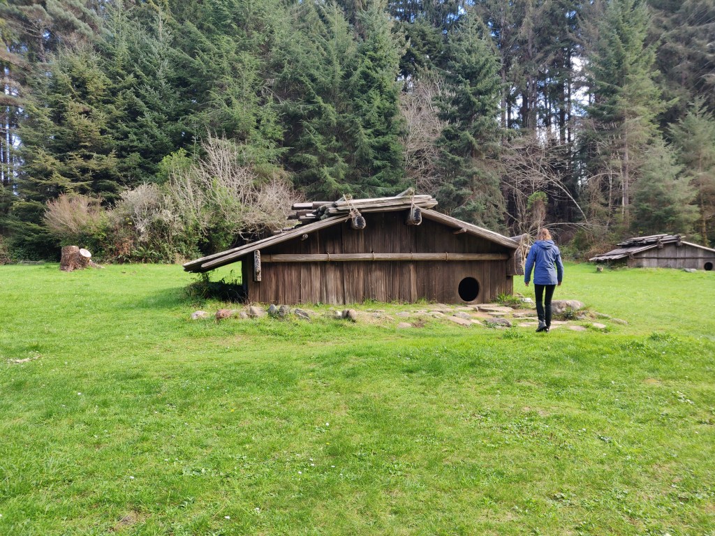 We saw some Roosevelt elk close up. What are called elk (Cervus canadensis) in North America are really closer to what we’d call red deer in the UK (Cervus elaphus). Concurrently what are called elk in Europe (Alces alces) are moose (also Alces alces) in North America. In the NP Centre, they had an interesting example of a (NA) elk which had got its head stuck in a tree trunk and died, with its skull being subsumed into the wood. We also saw a reconstruction of a traditional native Yurok village, with round entrance holes into buildings which are big enough for a person but too small for a bear.