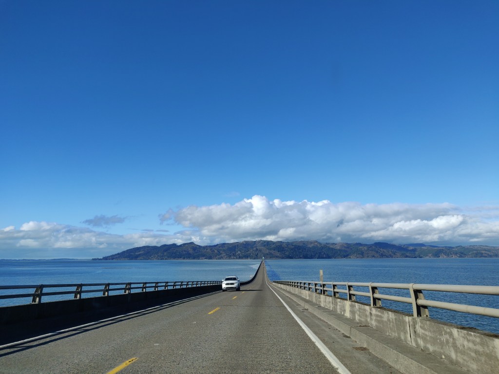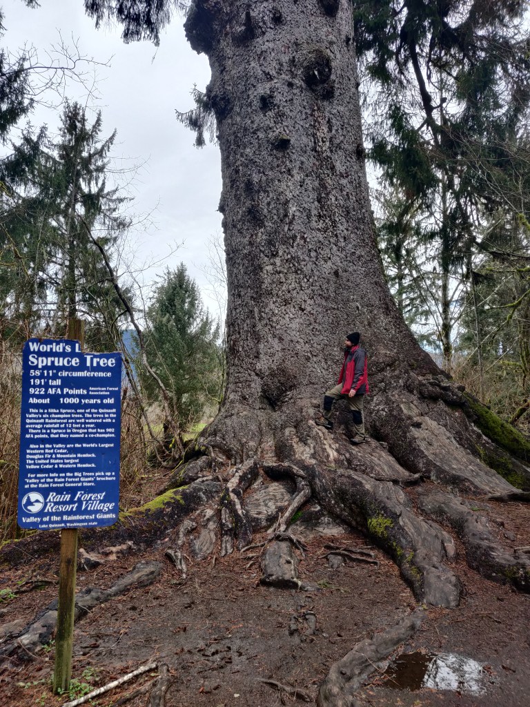 We crossed from Oregon to Washington on an impressive bridge, built to allow dense road traffic to cross over the Columbia while keeping Portland open to international shipping. Washington was even more grey-skyed and coniferous than Oregon. We saw the world’s largest spruce and some interesting trees dealing with erosion on the coast. Another thing in America is the amount of large driftwood here – some of the driftwood trunks we came across would have been record-breaking trees in Europe.